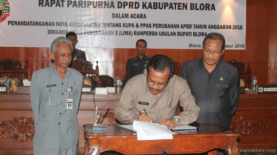 BLORA (wartablora.com)—Anggaran Pendapatan dan Belanja Daerah (APBD) Perubahan tahun ini disahkan Selasa (20/9/206). Pengesahan ini ditandai dalam penandatanganan nota kesepahaman di dokumen Kebijakan Umum Perubahan Anggaran (KUPA) dan Prioritas dan Plafon Anggaran Sementara (PPAS) antara Bupati Blora dengan unsur Pimpinan DPRD Kabupaten Blora. Penandatanganan tersebut dilakukan dalam rapat paripurna yang digelar di Gedung DPRD Kabupaten Blora, Jalan A Yani, Blora, Selasa siang.