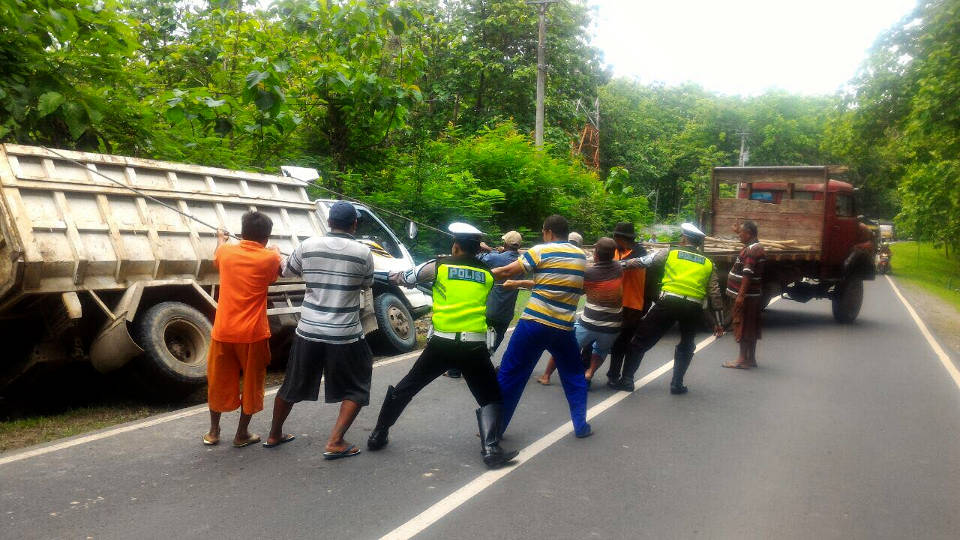 Dengan menggunakan tali tambang, anggota kepolisian dibantu warga yang melintas berusaha menarik truk agar berdiri. Sempat mengundang bantuan truk yang melintas untuk turut menariknya. Setelah lebih 1 jam berusaha memberdirikan truk, akhirnya truk yang terguling itupun bisa kembali ke jalan raya. (*)