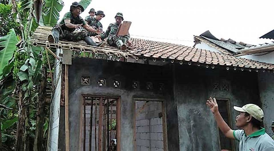 Saat pemasangan genteng rumah yang proses perehabannya akan selesai, sejulah anggota Satgas dan warga setempat melakukan akrobatik. Yakni dengan cara melempar dari bawah dan ditangkap para anggota Satgas yang sudah siap stanbay di tas atap rumah.