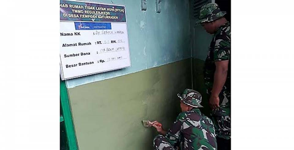BANYUMAS, (wartablora.com) - Para Satgas TMMD Reguer ke-99 Kodim 0701/Banyumas akan menyelesaikan proses rehab Ruah Tidak Layak Huni (RTLH) milik Sarkim warga Desa Rempoah, Kecamatan Baturaden. ''Kami yakin rehab rumah Pak Sarkim ini selesai, saat ini sudah memasuki tahap finishing teraakhir, yakni pengecetan,'' ungkap Sertu Eko, salah satu anggota Satgas TMMD Rempoah.