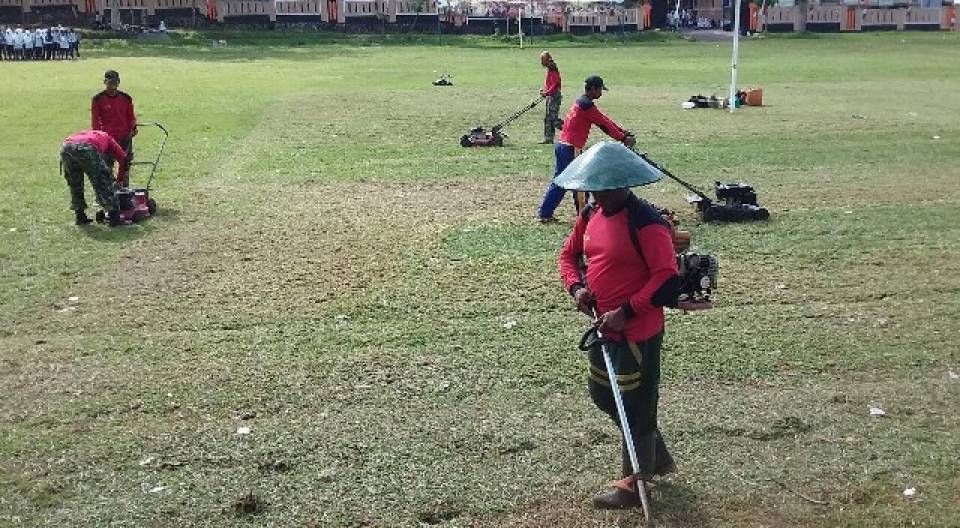 Sejumlah anggota TUUD Kodim 0701/ Banyumas yang dikomandoi oleh Peltu Ratwan, terus menyisir laangan Desa Rempoah, untuk merapikan rumput di lapangan itu. ''Pemerataan rumput lapangan yang akan digunakan upacara penutupan TMMD ini wajib hukumnya untuk dirapikan, sebelum dipasang pernik-pernik perlangkapan upacara lainnya,'' ungkap Peltu Ratwan. *)