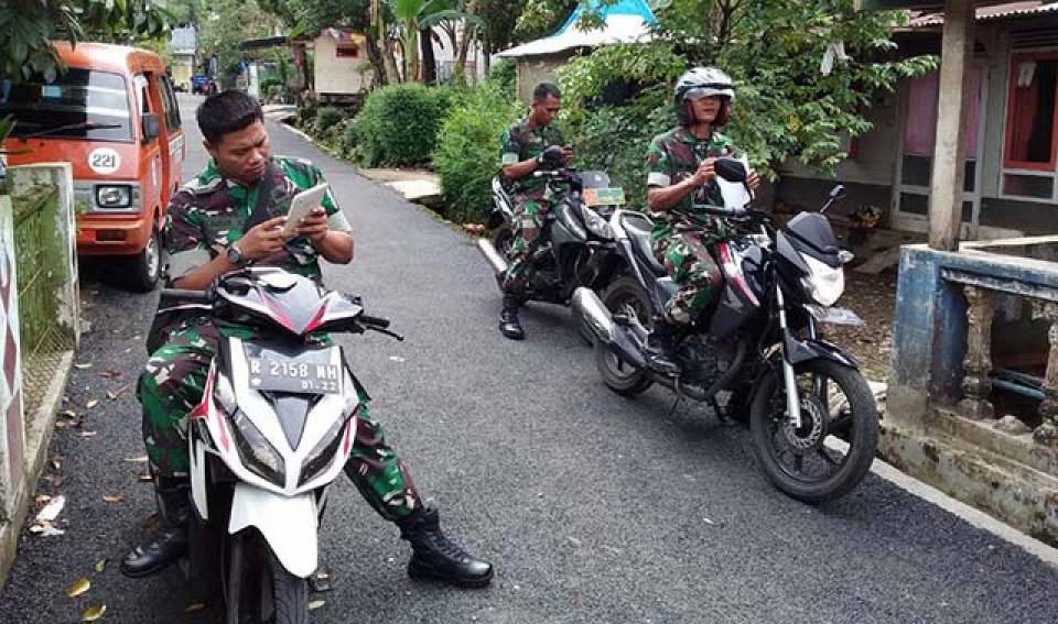BREBES - Batibakti TNI Sterdim 0713/Brebes, Serma Arifin dengan didampingi Babinsa Banjarharjo, Sertu Eko harus menyisir lorong Desa Cikuya untuk menentukan titik ordinat Rumah Tidak Layak Huni warga Desa Cikuya yang akan direhab dalam kegiatan TMMD.