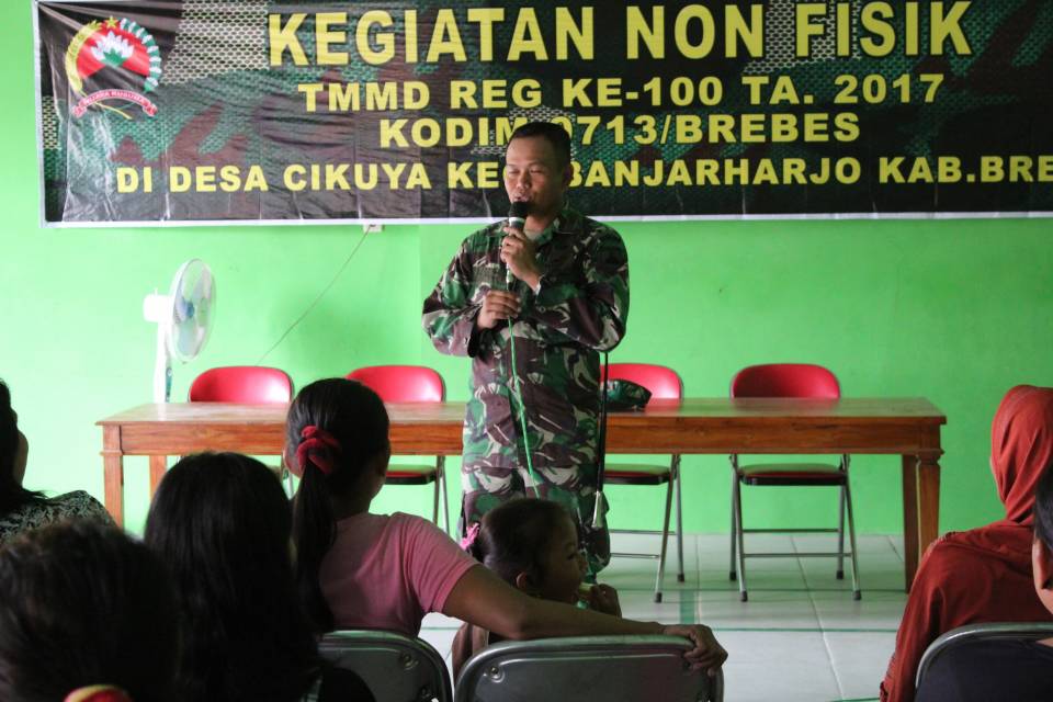 BREBES - Saat mengikuti penyuluhan tentang wawasan kebangsaan pada kegiatan non fisik di gelaran TMMD Reguler ke-100 Kodim 0713/Brebes, seorana pemuda Desa Cikuya (desa sasaran TMMD Reguler Kodim Brebes), Isro Wijantopo, mengaku kagum dengan sosok Jenderal Soedirman, terutama perjuangannya. ''perjuanga Jendral Soedirman sangat luar biasa dan bisa menjadi contoh bago para pemuda saat ini,'' ungkap Isro.