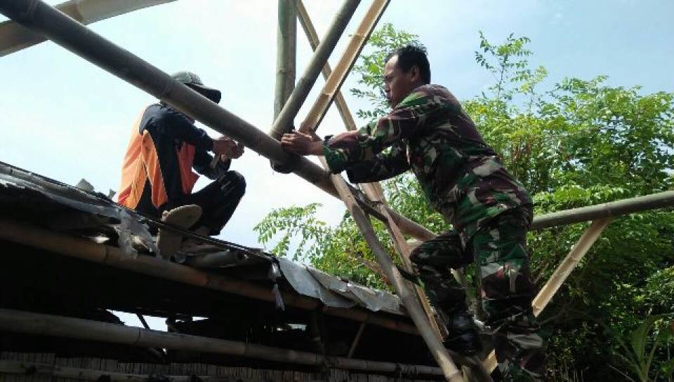 BREBES - Ini aksi cekatan para anggota Satgas TMMD Reguler ke-100 Kodim 0713/Brebes di Desa Cikuya, yang diploting di sasaran fisik rehab Rumah Tidak Layak. Dengan dibantu warga, satu persatu RTLH yang dudah ditenutkan akan direhab, mulai dibongkar.