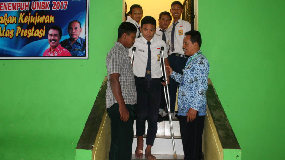 Bima Wahyu Wicaksono, siswa SMP 1 Jepon usai mengikuti UNBK di hari pertama. Bima terpaksa menggunakan tongkat untuk tetap ikut dalam UNBK setelah beberapa hari sebelumnya mengalami kecelakaan.